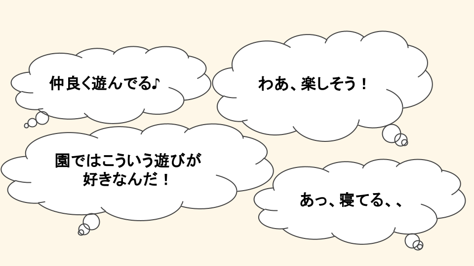 当園では、正面入口1台、保育室1台カメラが作動しております。 映像をLIVE配信しているため、お子様のご様子をいつでもリアルタイムでご覧いただけます。 おうちとは違う一面や、イベントごとの活動も見ることができるので、 保護者様のみならず、祖父母の方からも大変喜ばれております。